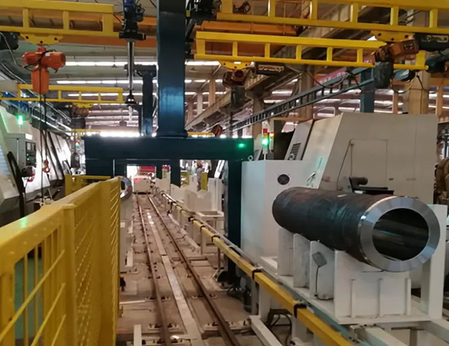 作為煤炭采掘設(shè)備的核心部件中缸筒,其中缸和外缸尺寸不一,但都是大型設(shè)備:最重的有1.5噸,長度達2.5米。在生產(chǎn)過程中,如何對它們進行穩(wěn)定運輸,并在較短時間內(nèi)完成多個加工工序成為一大難題。原來各個工序之間的物流都是由工人通過行吊完成,不僅費時費力,而且存在安全隱患。另外,由于加工設(shè)備布局分散,物流倒短時間長,導(dǎo)致生產(chǎn)效率難以提高。
